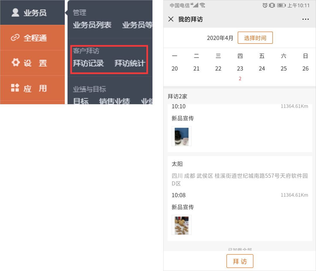 在管理后臺可以查看業務員拜訪出行情況,業務員端拜訪功能優化升級,可更直觀添加、查看自己的拜訪記錄。