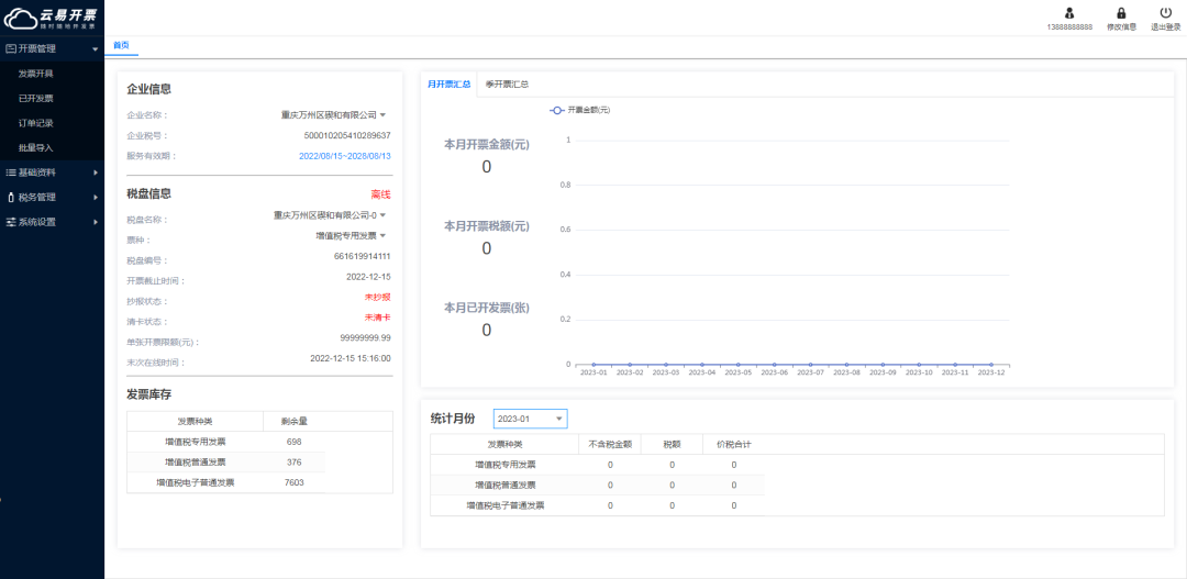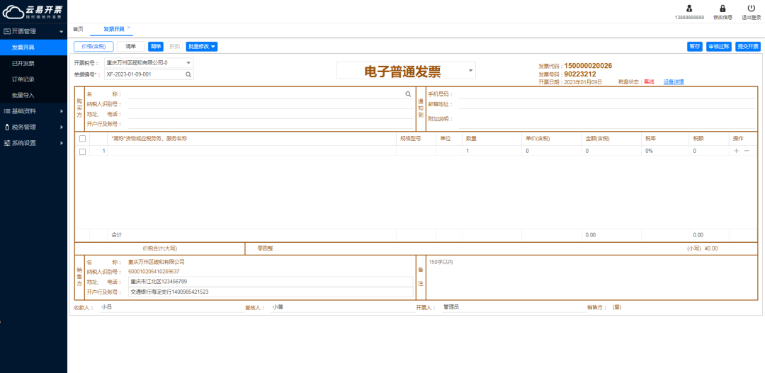 云易開(kāi)票支持籃字發(fā)票開(kāi)具,紅字發(fā)票開(kāi)具,發(fā)票自動(dòng)交付、打印、統(tǒng)計(jì)等操作。也支持查看稅盤(pán)設(shè)置狀態(tài),查看發(fā)票庫(kù)存,發(fā)票領(lǐng)用,自動(dòng)清卡抄報(bào)等功能。