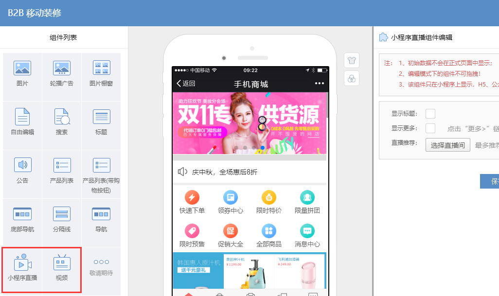 移動端商城裝修增加了小程序直播、視pin裝修組件,可以在首頁展示更多特色