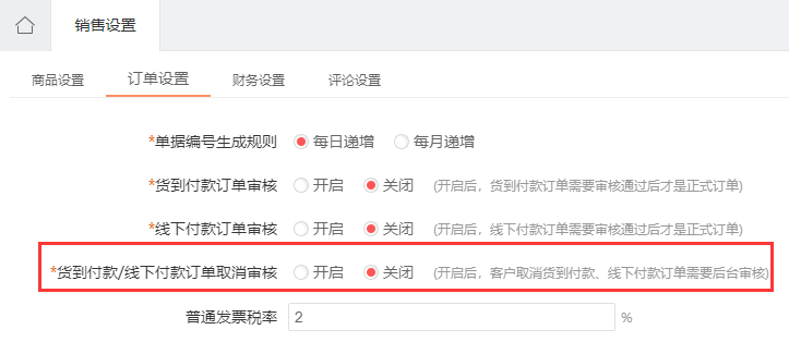 針對貨到付款訂單、線下付款訂單,客戶取消時,可設(shè)置是否需要管li員審核
