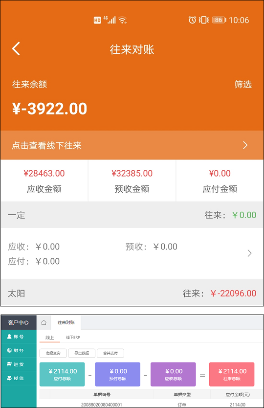 PC端、移動端客戶中xin新增客戶自查線上往來對賬,同時;移動端管理中xin新增業(yè)務(wù)員查詢管轄客戶線上往來對賬