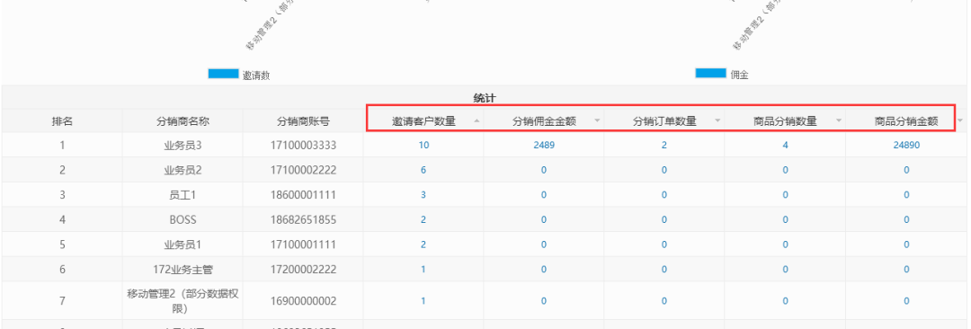 將原來分銷排名中xin修改為分銷統(tǒng)計中xin,并對統(tǒng)計排名數(shù)據(jù)進(jìn)行優(yōu)化, 方便管li員查看分銷商邀請客戶數(shù)量、分銷傭金金額、分銷訂單那數(shù)量、商品分銷數(shù)量、商品分銷金額等數(shù)據(jù)及明細(xì)